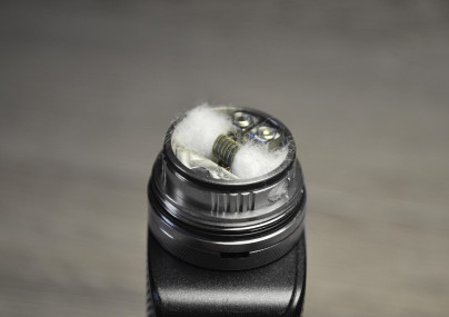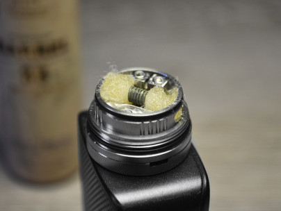 Ставим вату, тут этот процесс малость специфичный. Сначала ее потребуется завести внутрь спирали, а после этого концы поднять вверх, словно кроличьи ушки, и надеть сверху кольцо. В качестве ватки используем знаменитый «Бекон», но можно и любую другую, проблем с жижеподачей тут быть не должно.